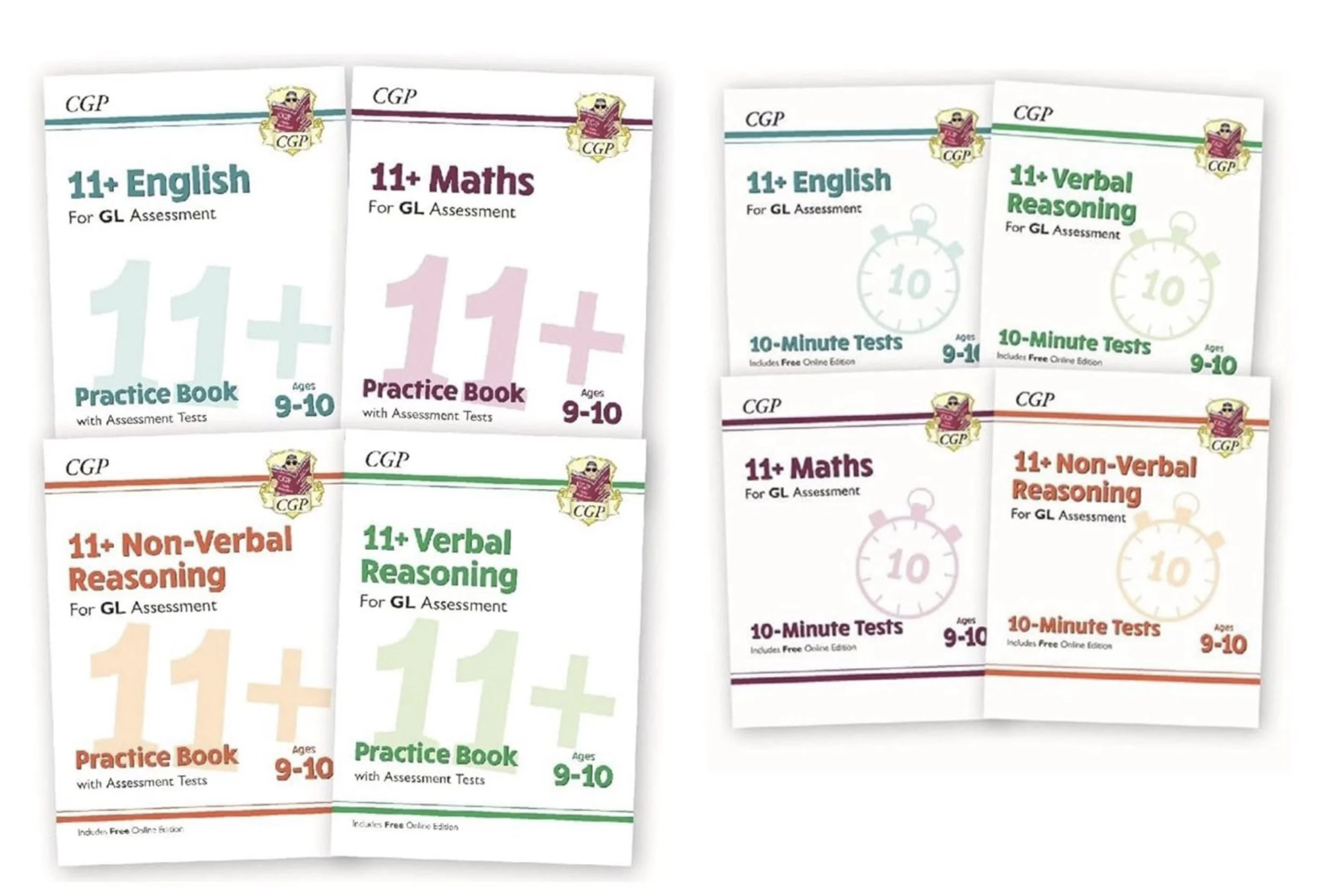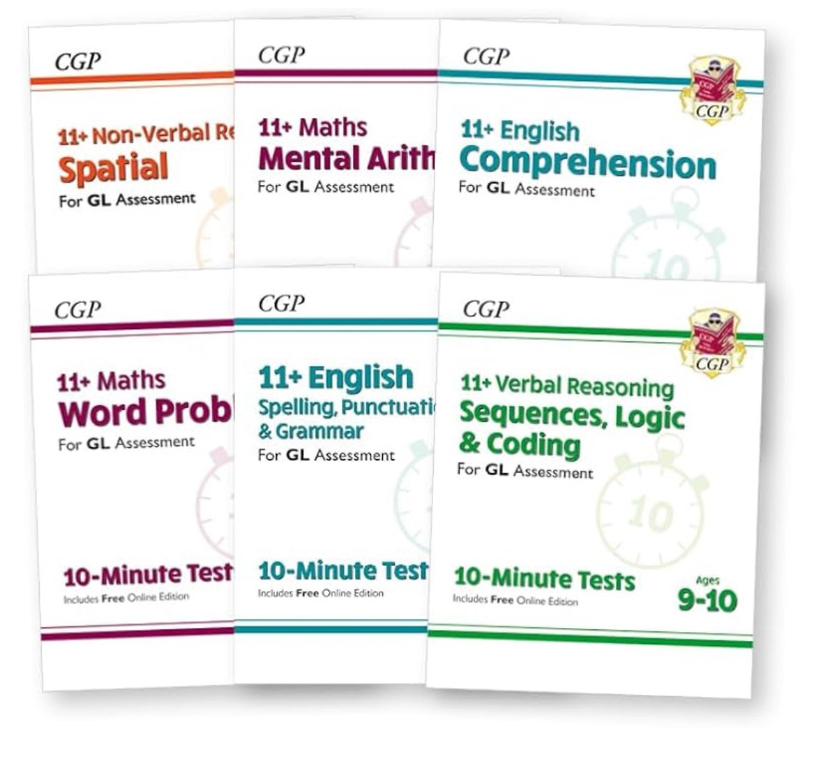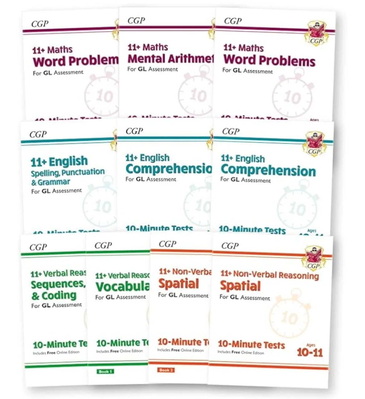 CGP 10 minute test books: English, Maths, Non-Verbal Reasoning& Verbal Reasoning.